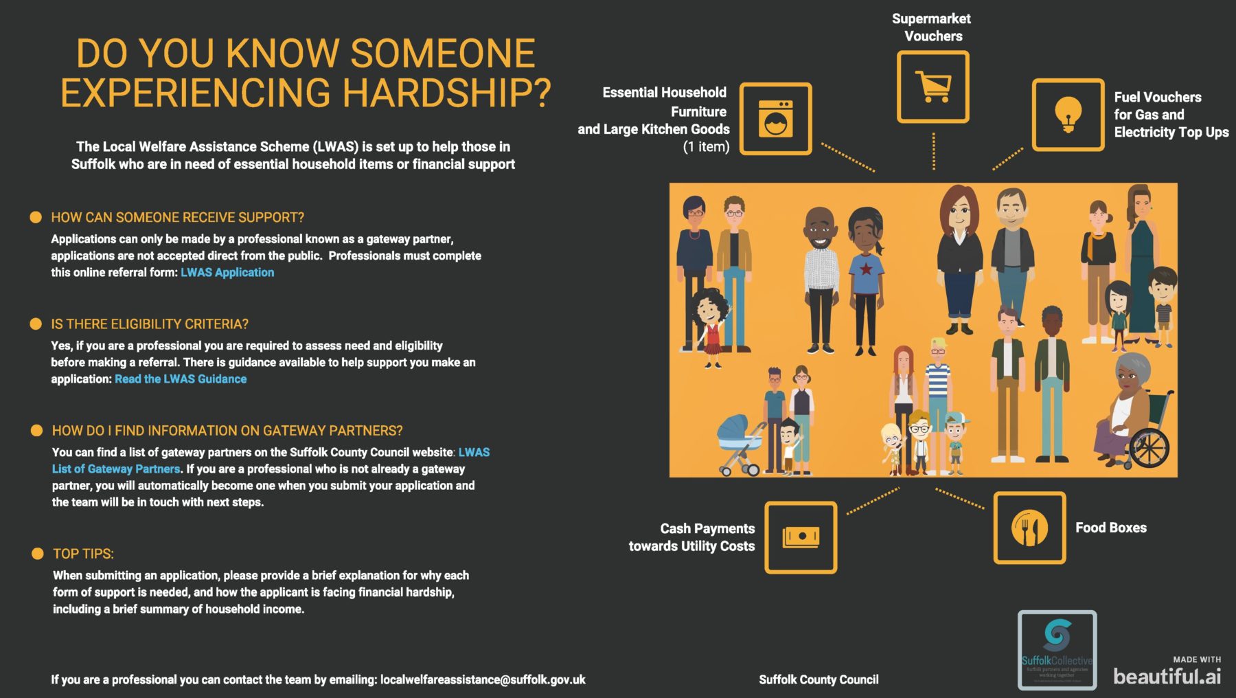 The Local Welfare Assistance Scheme (LWAS) is set up to help those in Suffolk who are in need of essential household items or financial support. You can find out more here.