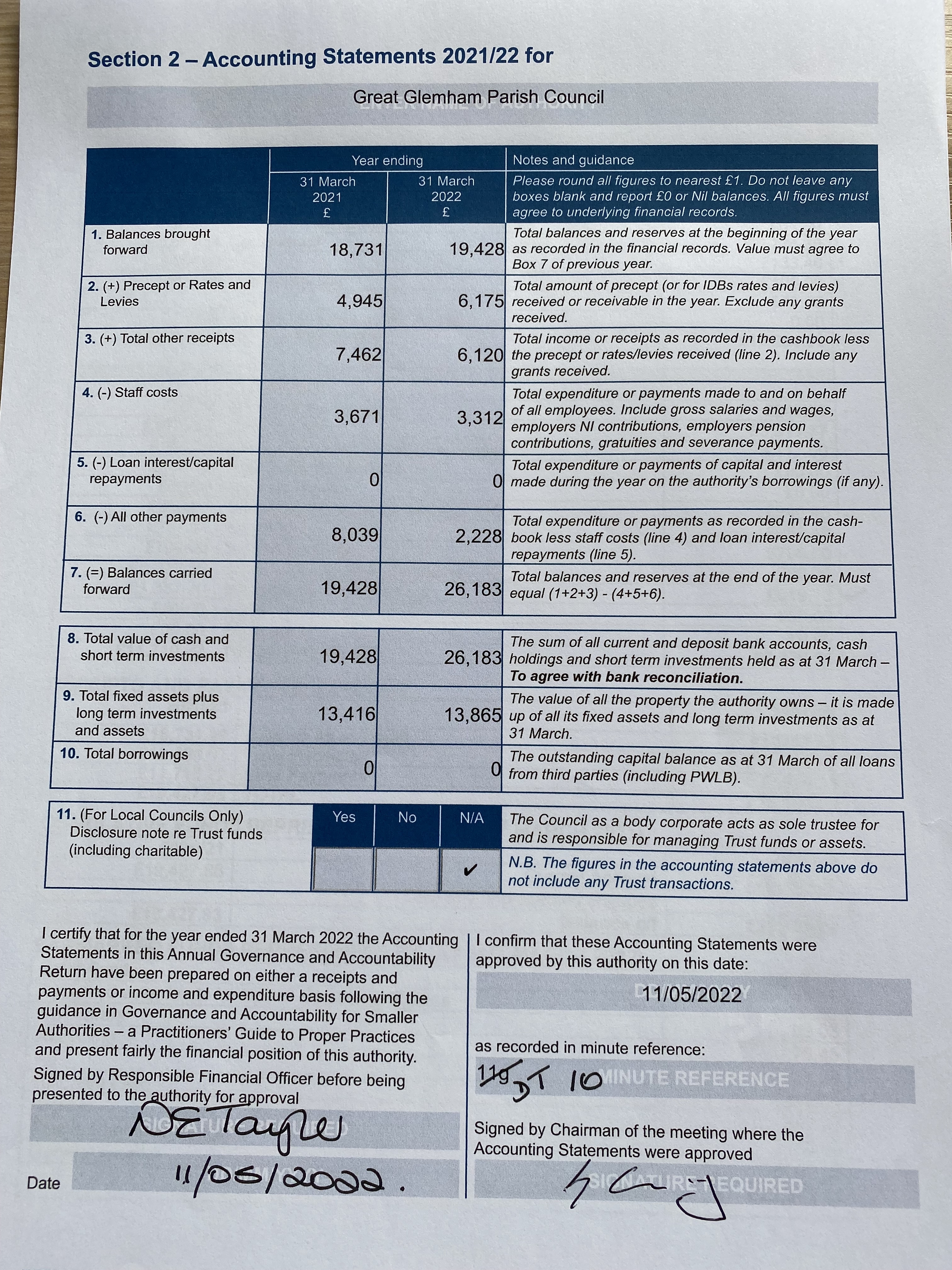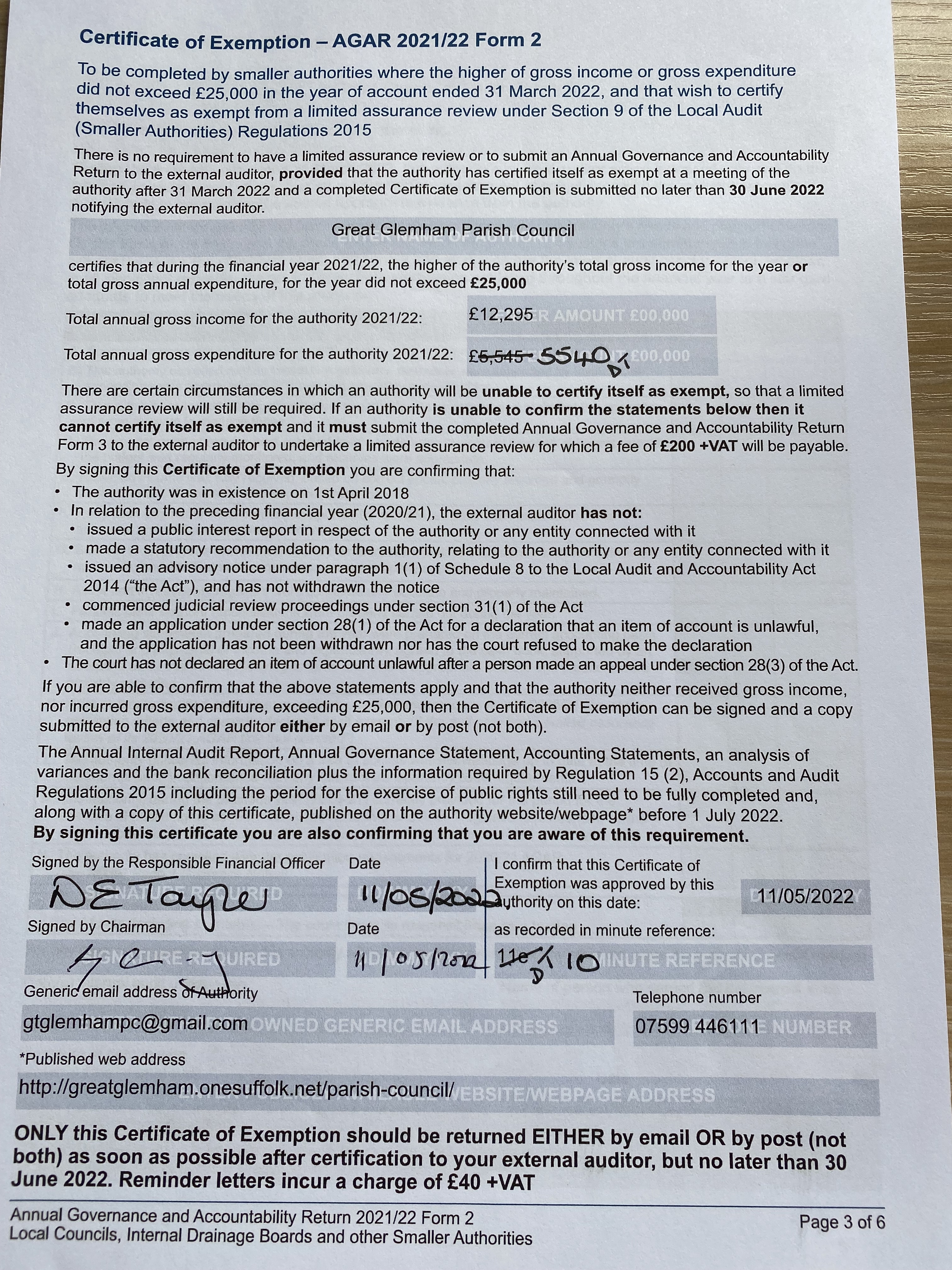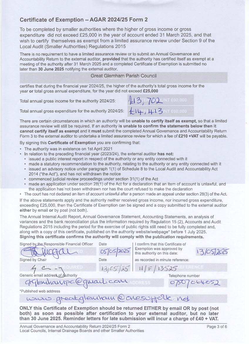The Parish Council has now received the completed Audit Report for 24/25 and that and accounting documents are available to view for any interested resident of the parish by prior arrangement. If you wish to have sight of the documents please contact the Parish Clerk, Suzie Grogan, via email to gtglemhampc@gmail.com.
